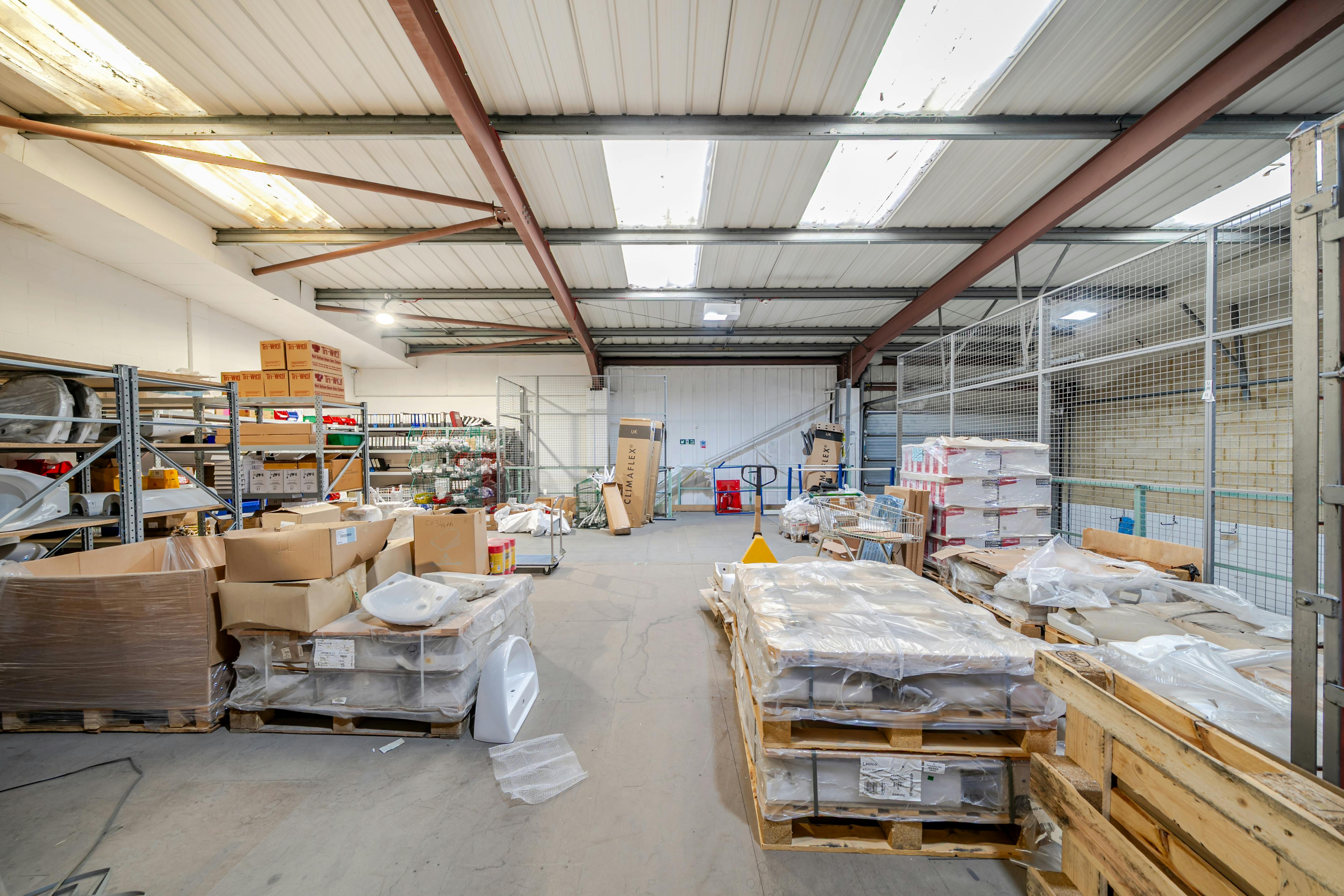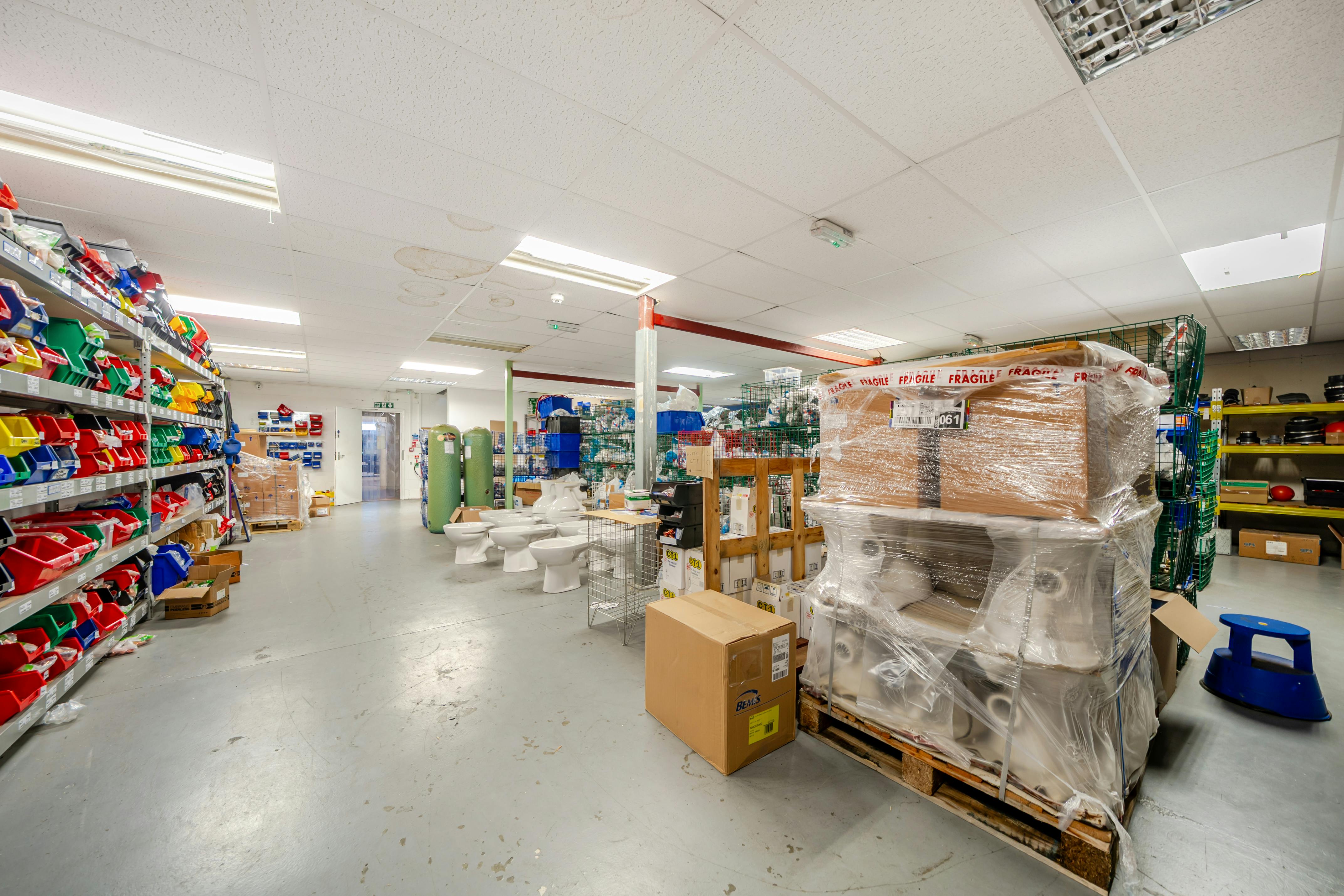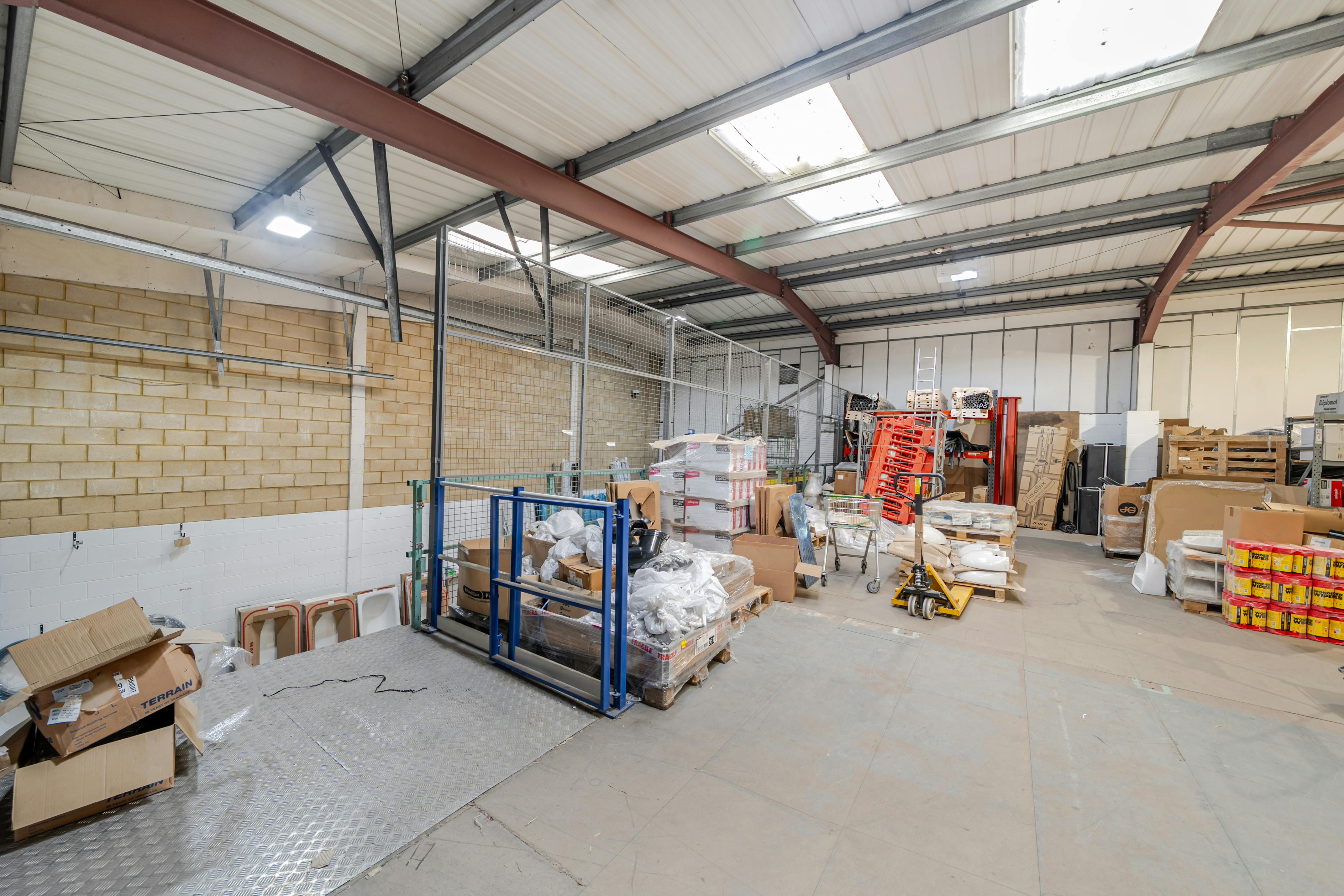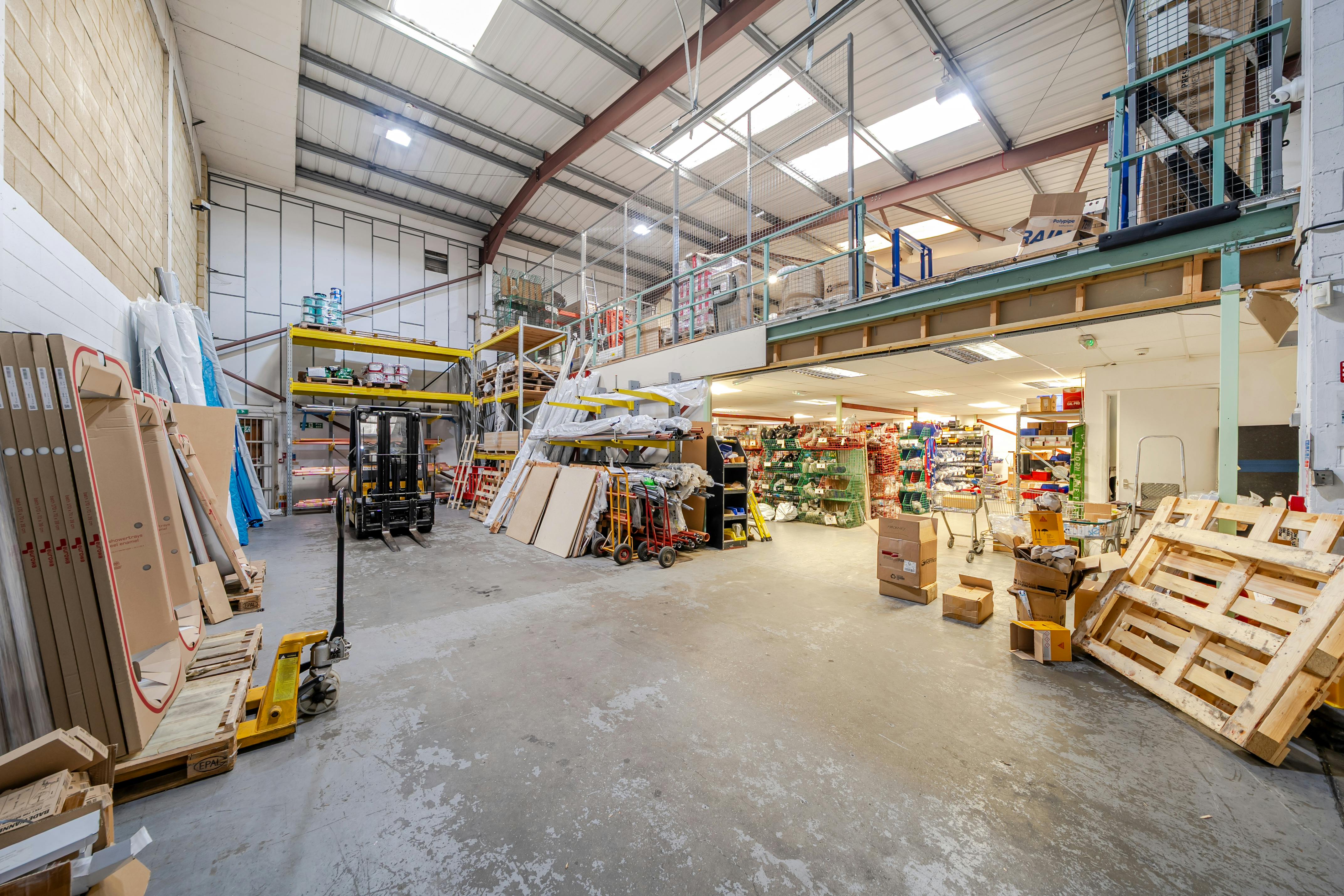 The ground Floor Warehouse area has a full height of 8m and a height under the Mezzanine floor of 2.46m and 5m above.