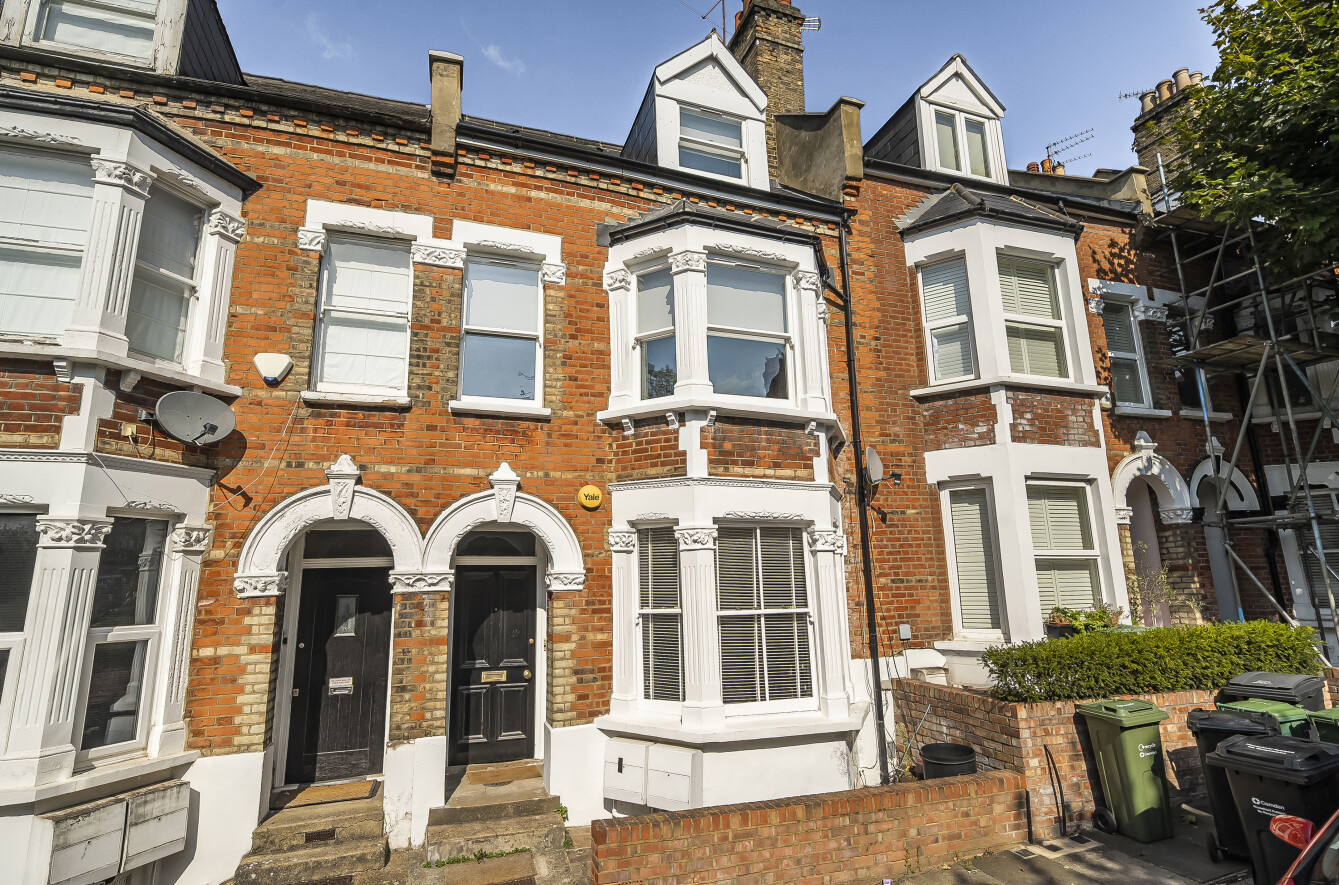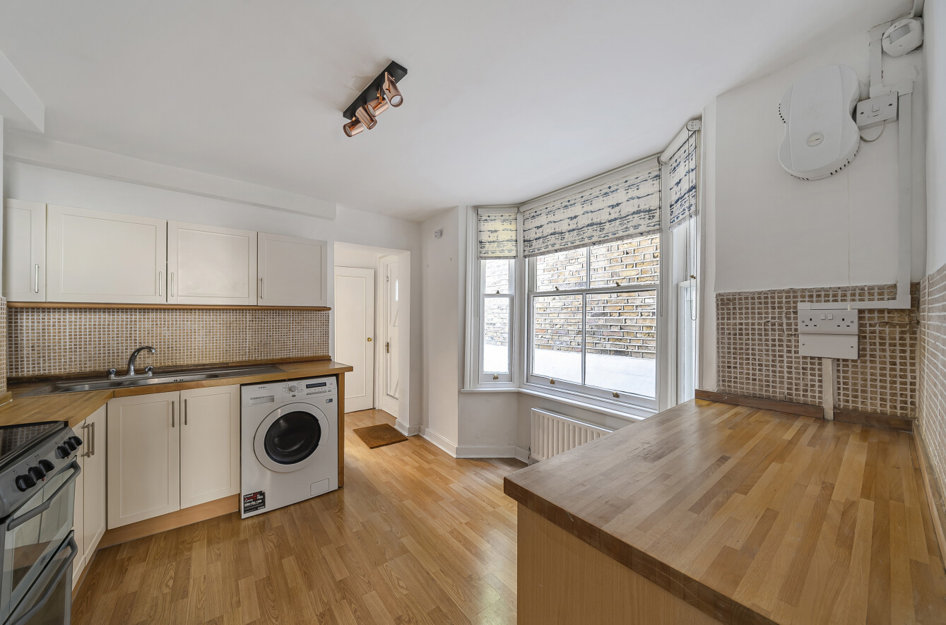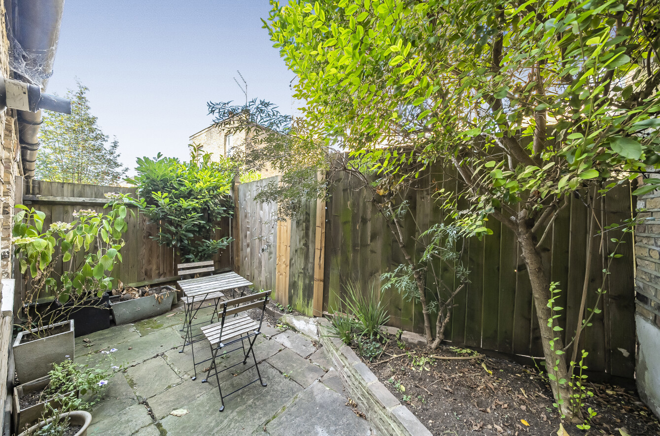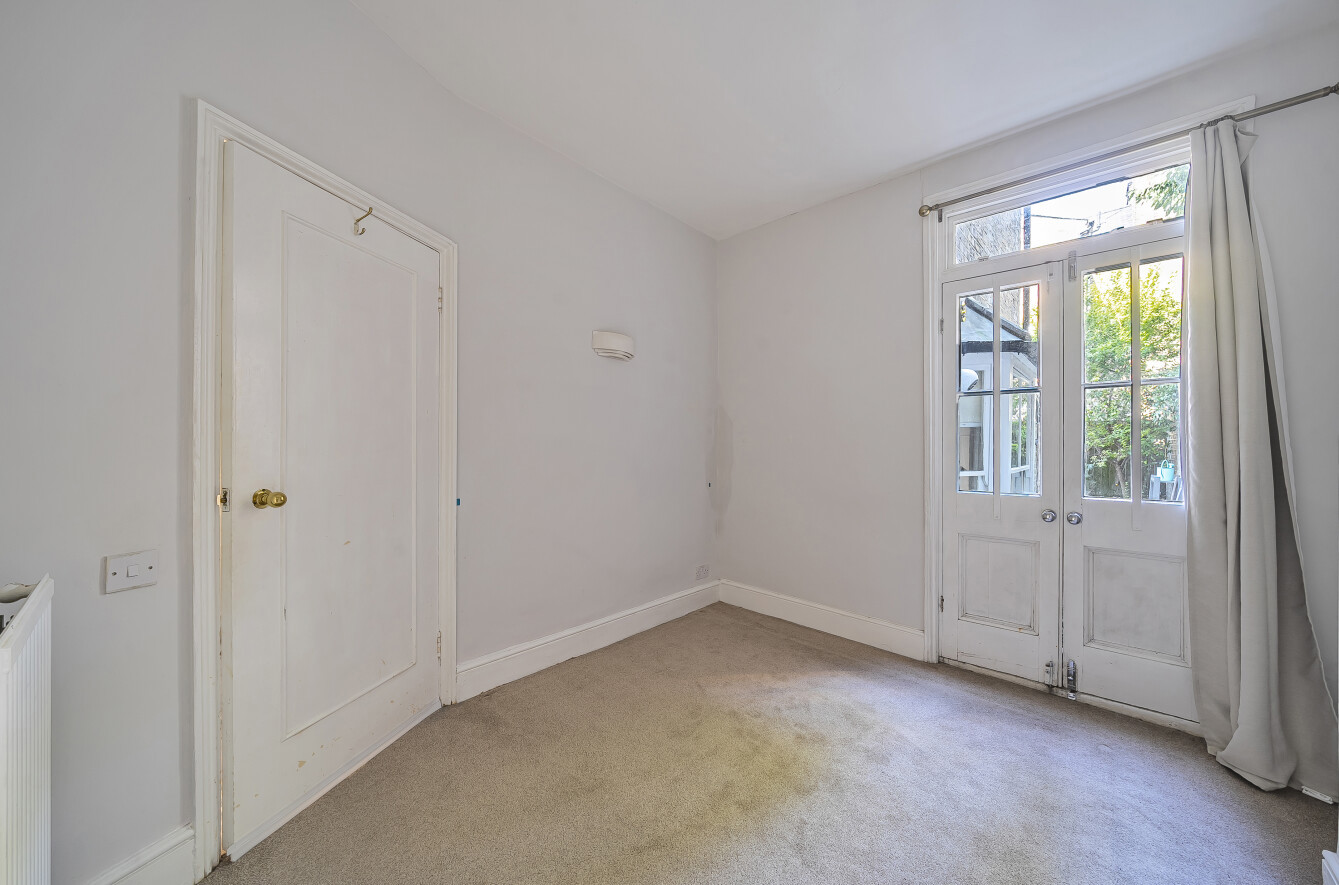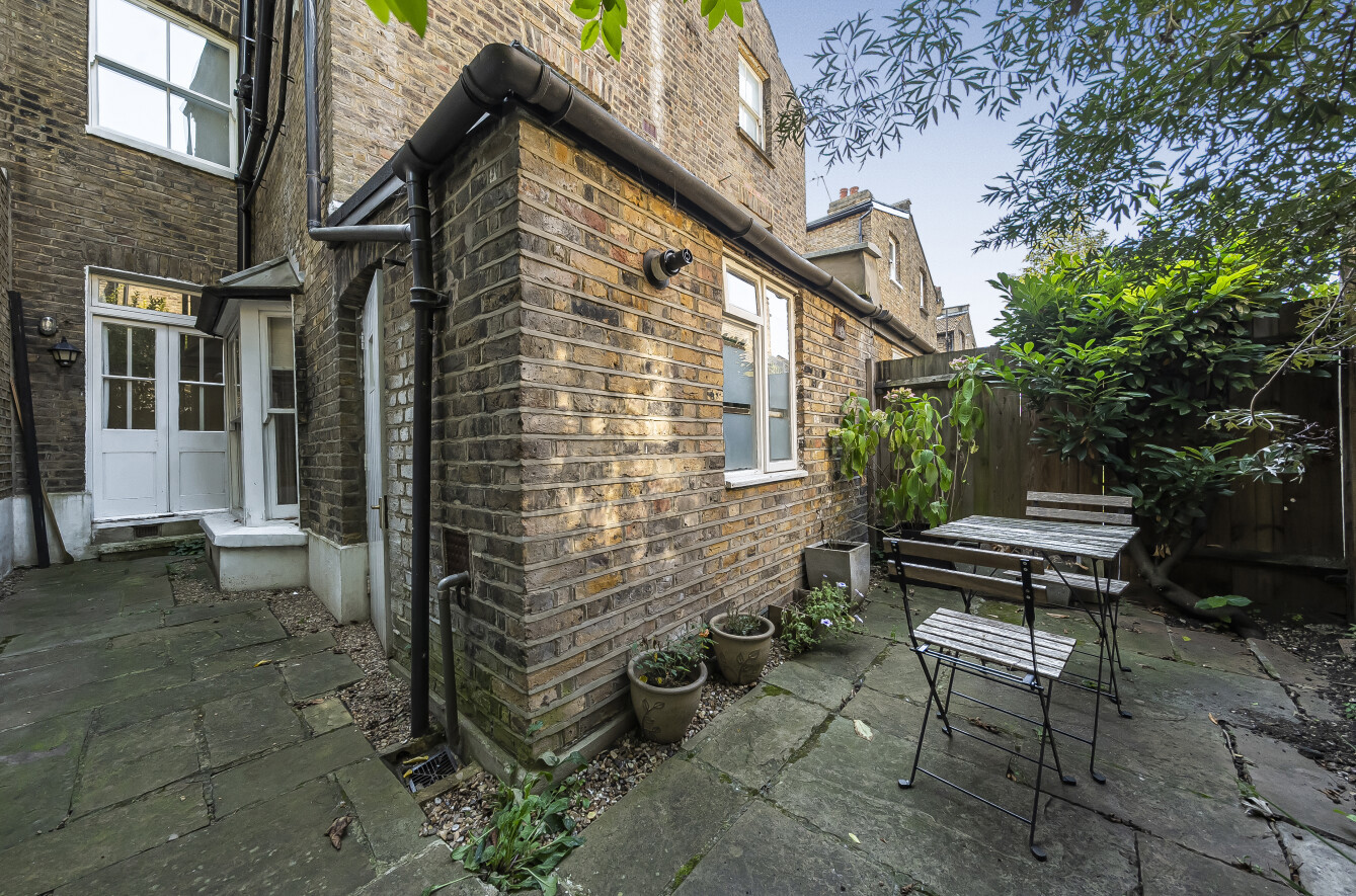 The apartment spans 522 sq. ft (48.4 sq. m) and benefits from high ceilings and large sash windows. The well-planned accommodation is configured with a spacious 13’11 x 11’7 south-facing reception, a larger than average 10’10 x 10’10 kitchen, a 3-piece bathroom and a peaceful 12’1 x 9’7 bedroom that has built-in storage and double doors that lead to the rear garden.