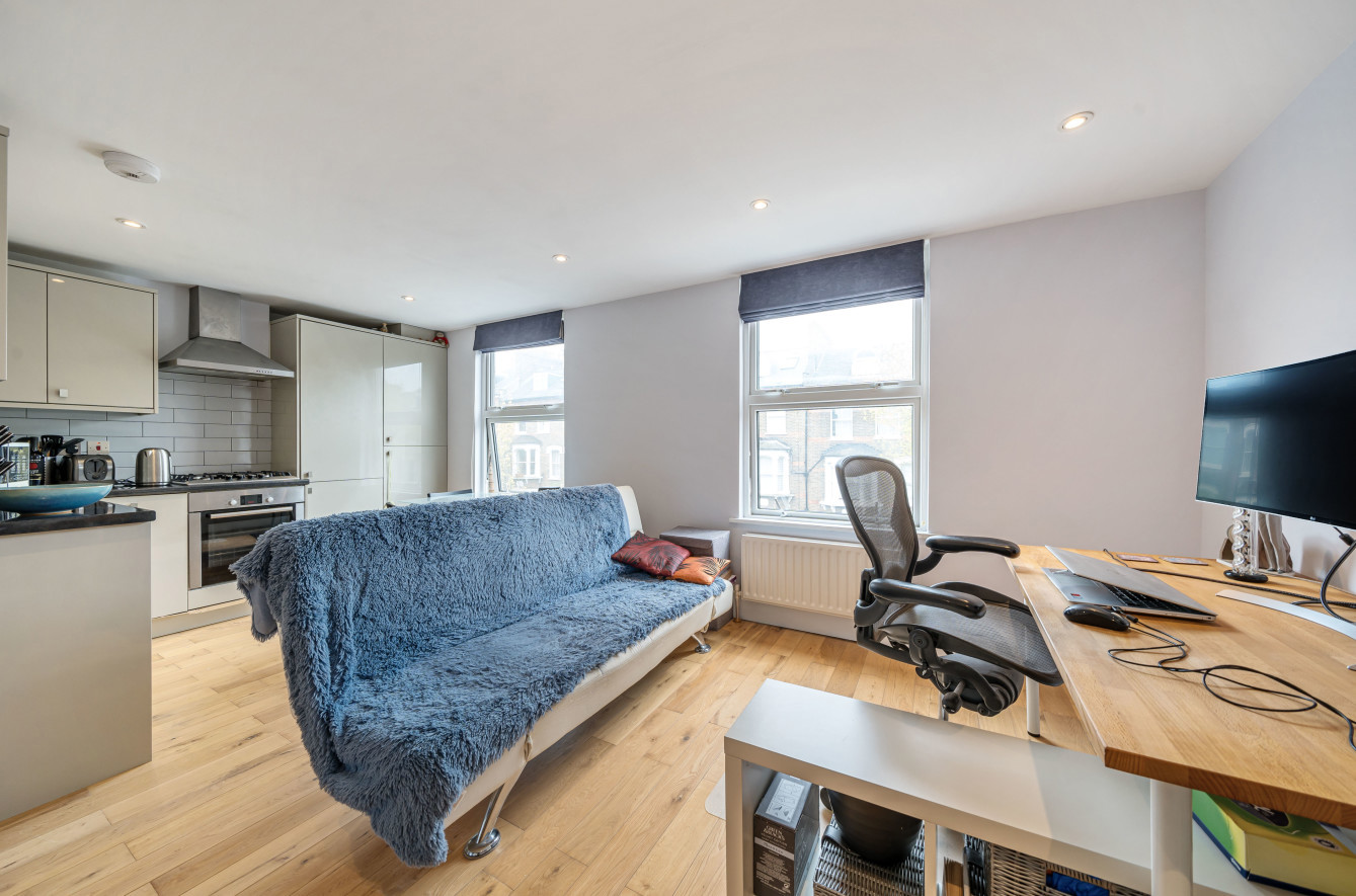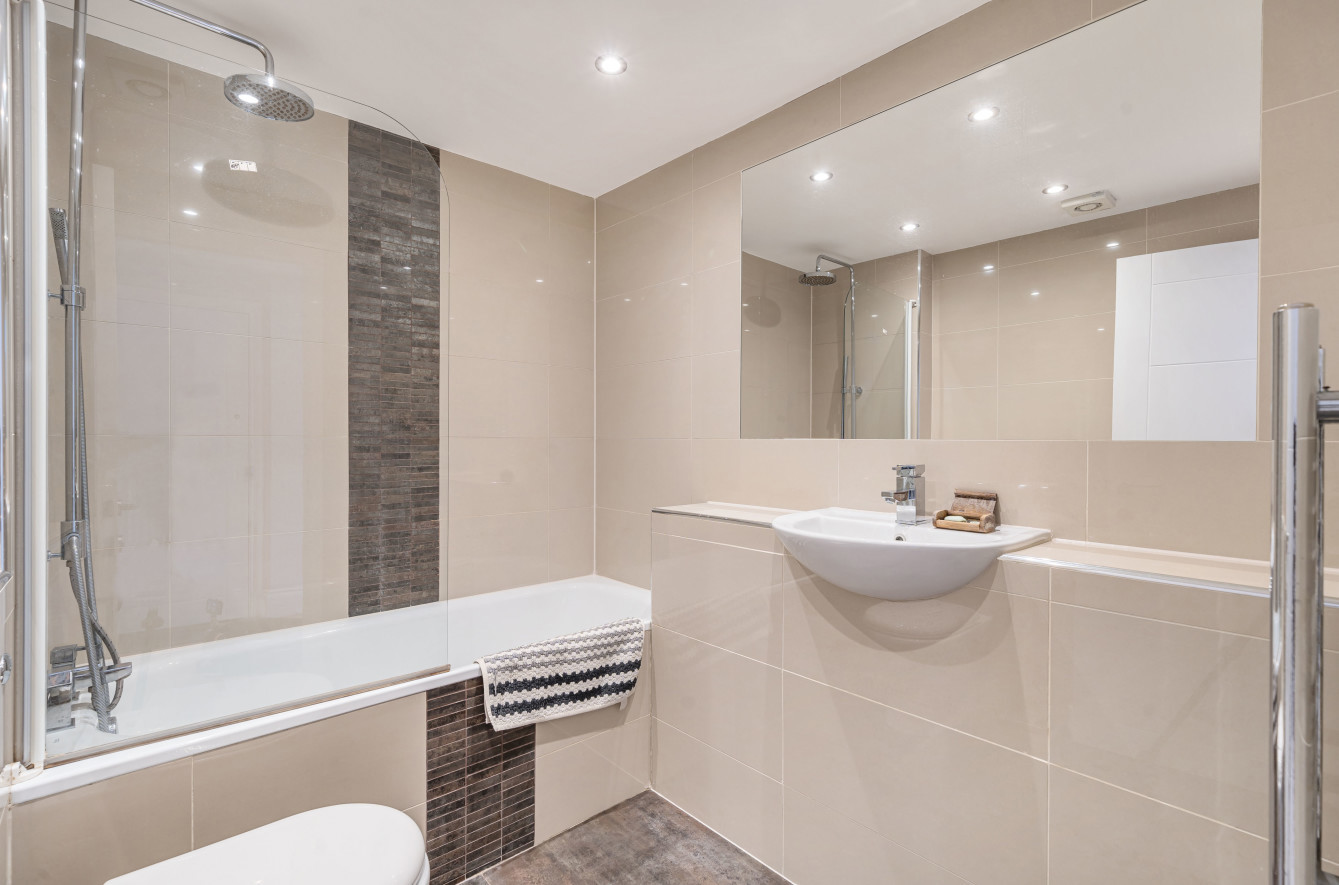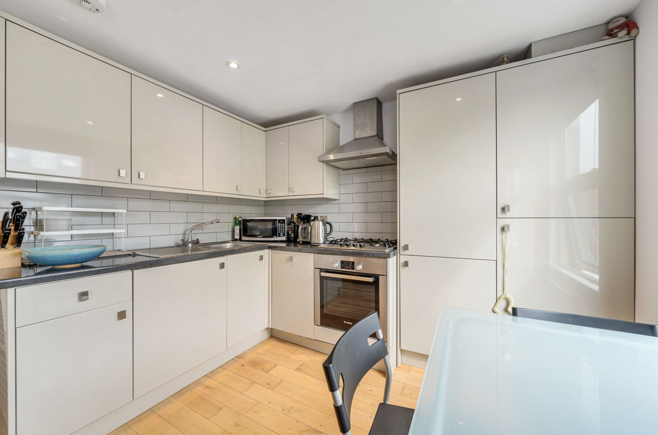 The apartment features a spacious 19' x 11'8 open plan living space with built in storage and a modern kitchen, with integrated appliances with both areas flooded with natural light due to the southerly orientation.
