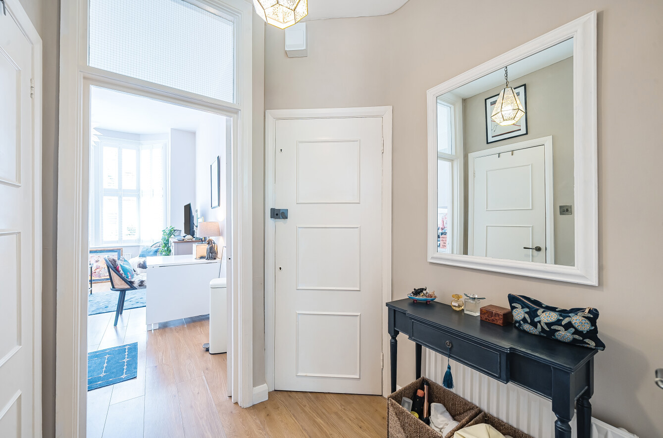 A wonderfully bright 1-bedroom apartment set on the raised ground floor of a converted period house with fantastic high ceilings and impressive large windows.