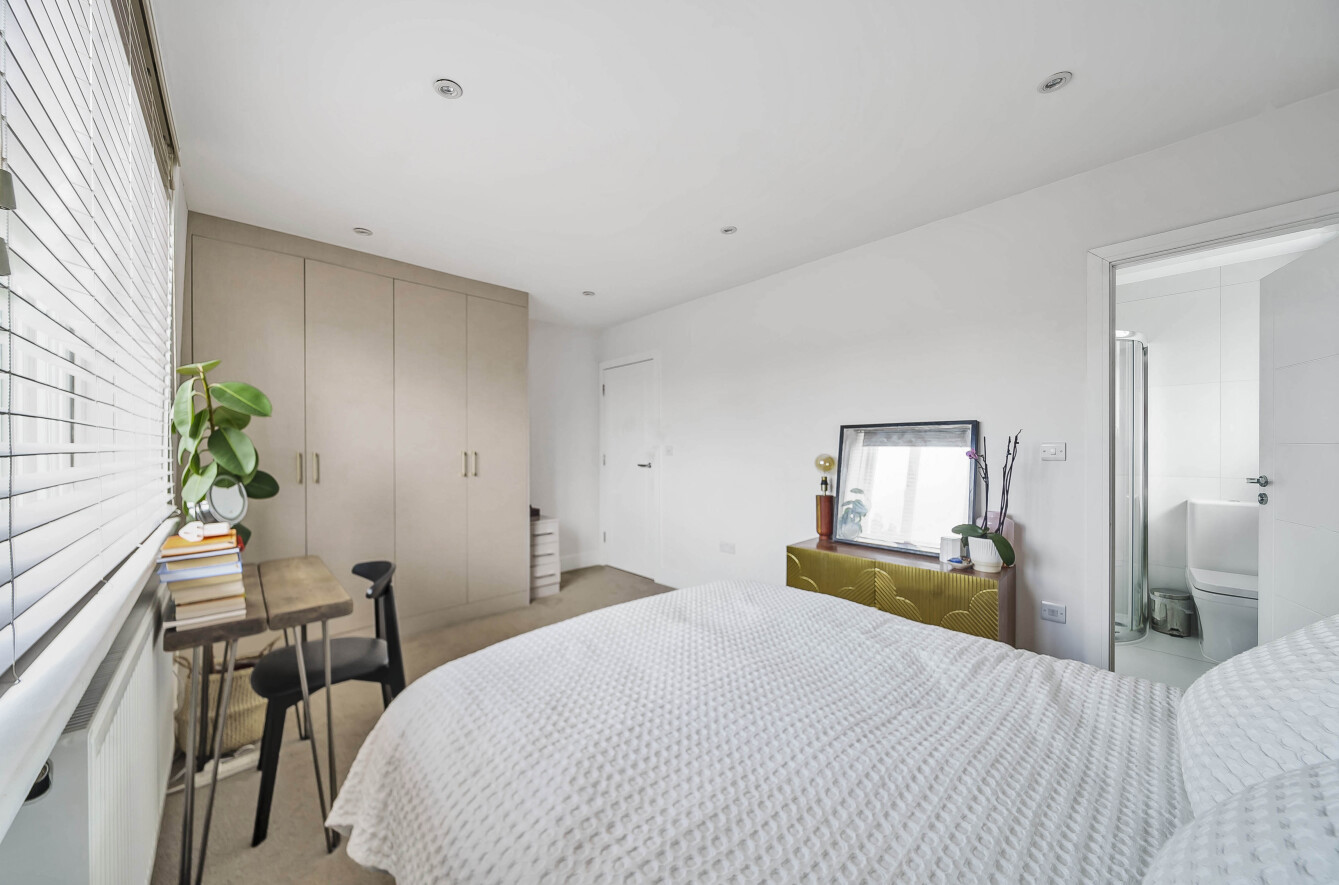 An impressive 18’7 x 17’3 open-plan living space and luxurious kitchen, with integrated appliances and a stone worktop, is found on the upper level making an ideal configuration. The spacious 15’ principal bedroom benefits from an ensuite shower room and fitted wardrobes, which are also found in the additional 2 double bedrooms. A sleek modern family bathroom completes this impressive home.