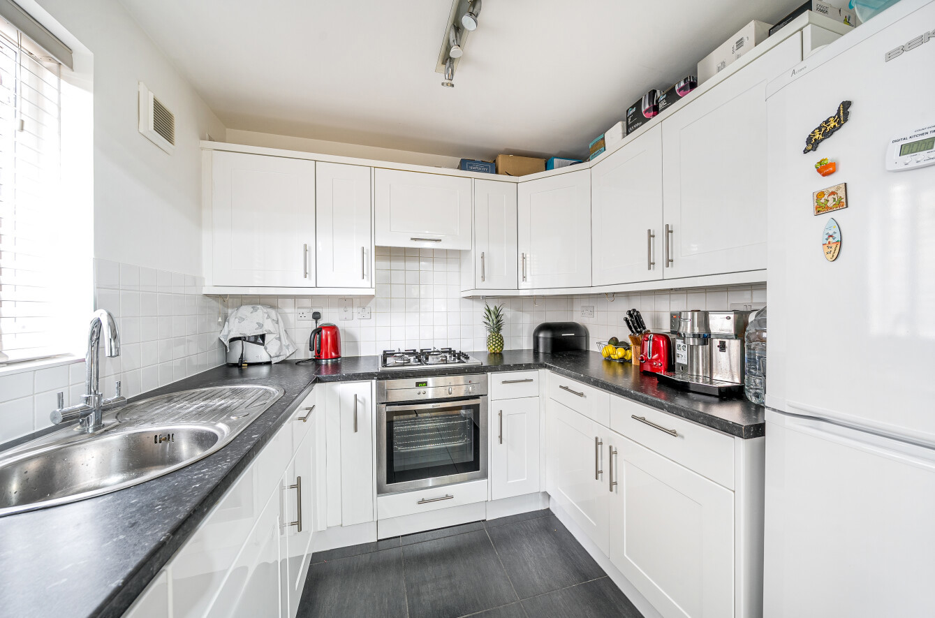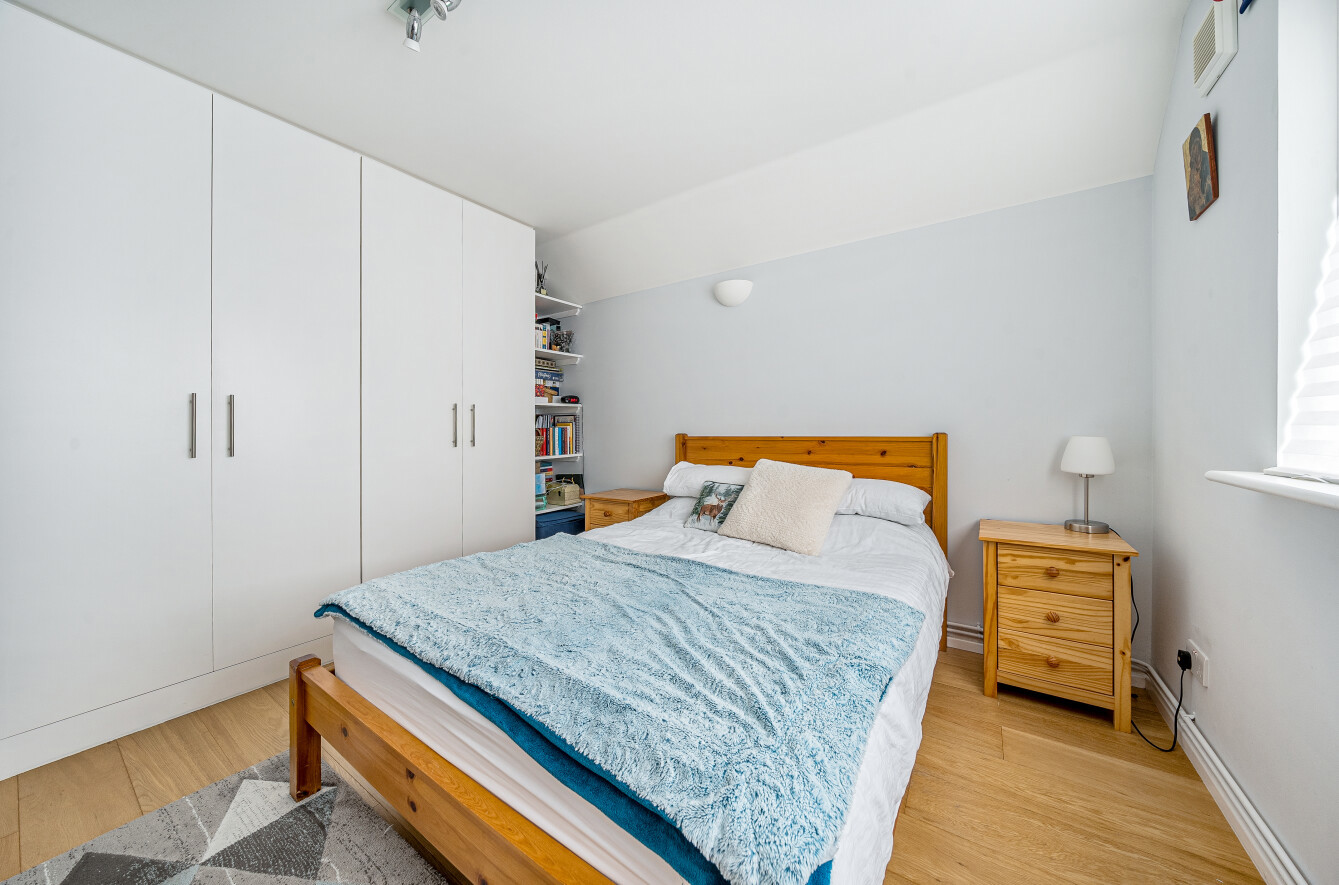 The flat is presented in excellent condition throughout and offers well-proportioned, light-filled rooms. The fully fitted kitchen includes a dishwasher with a washing machine within a utility cupboard and there is a living room with dining area. Wood flooring runs throughout, enhancing the clean, contemporary feel of the space.