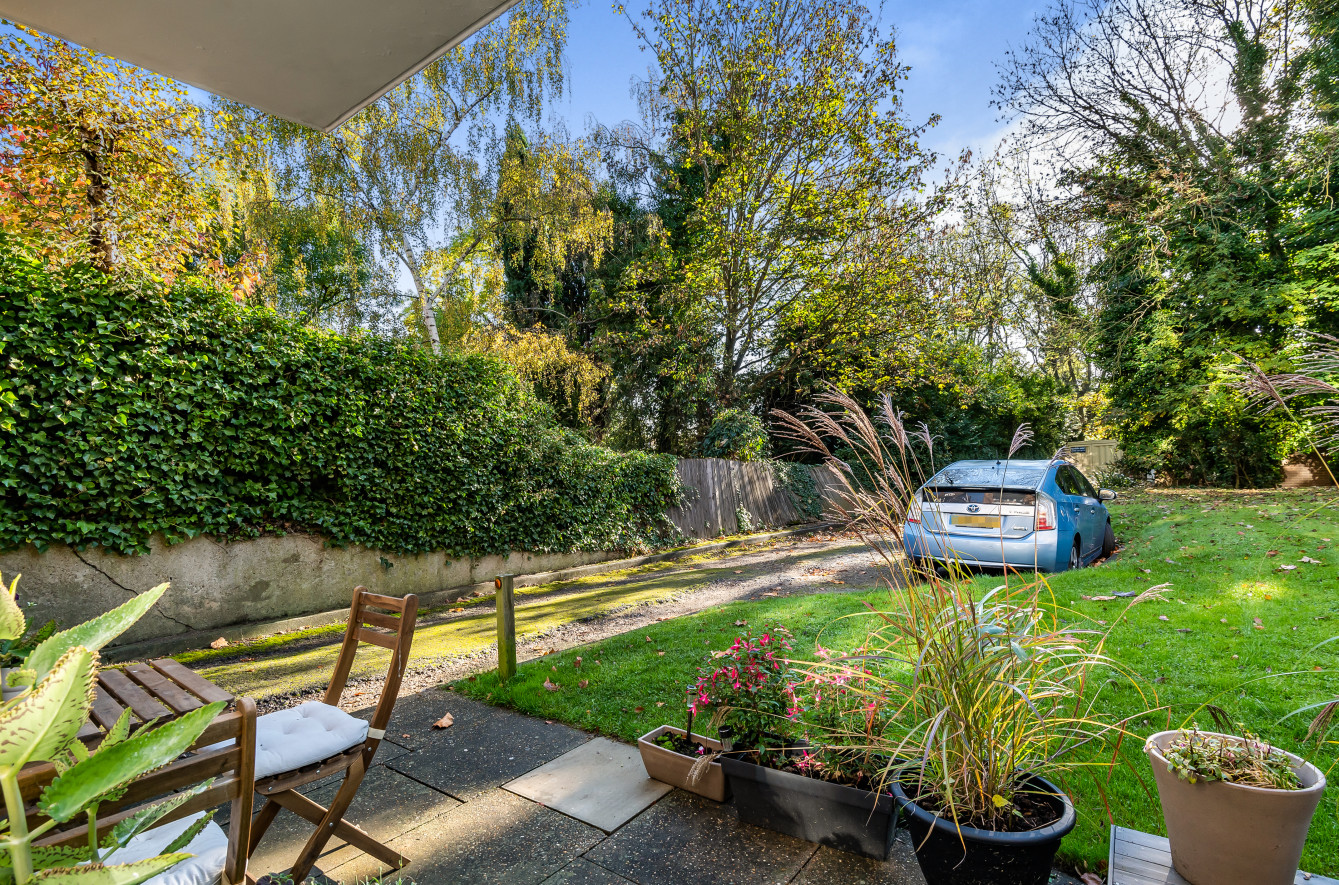 This spacious apartment features an open plan reception/ kitchen, two double bedrooms (one with an en-suite) with built in cupboards, a modern family bathroom and a private patio backing onto communal garden.
