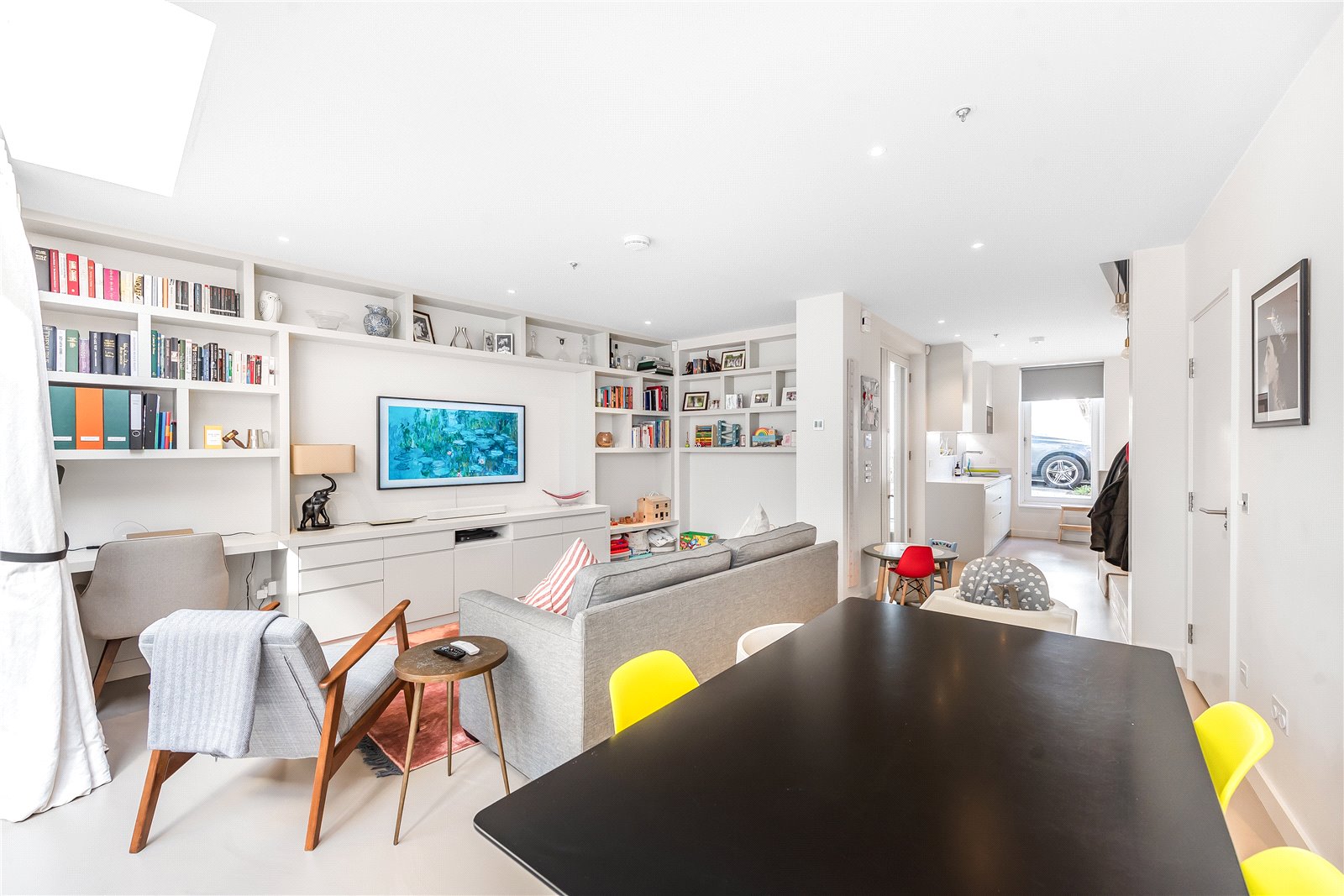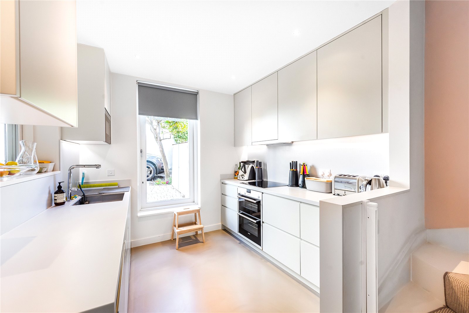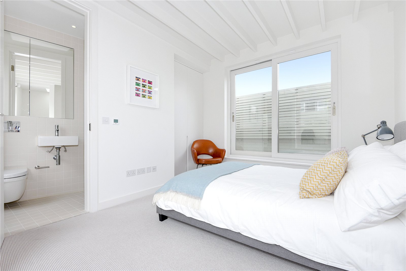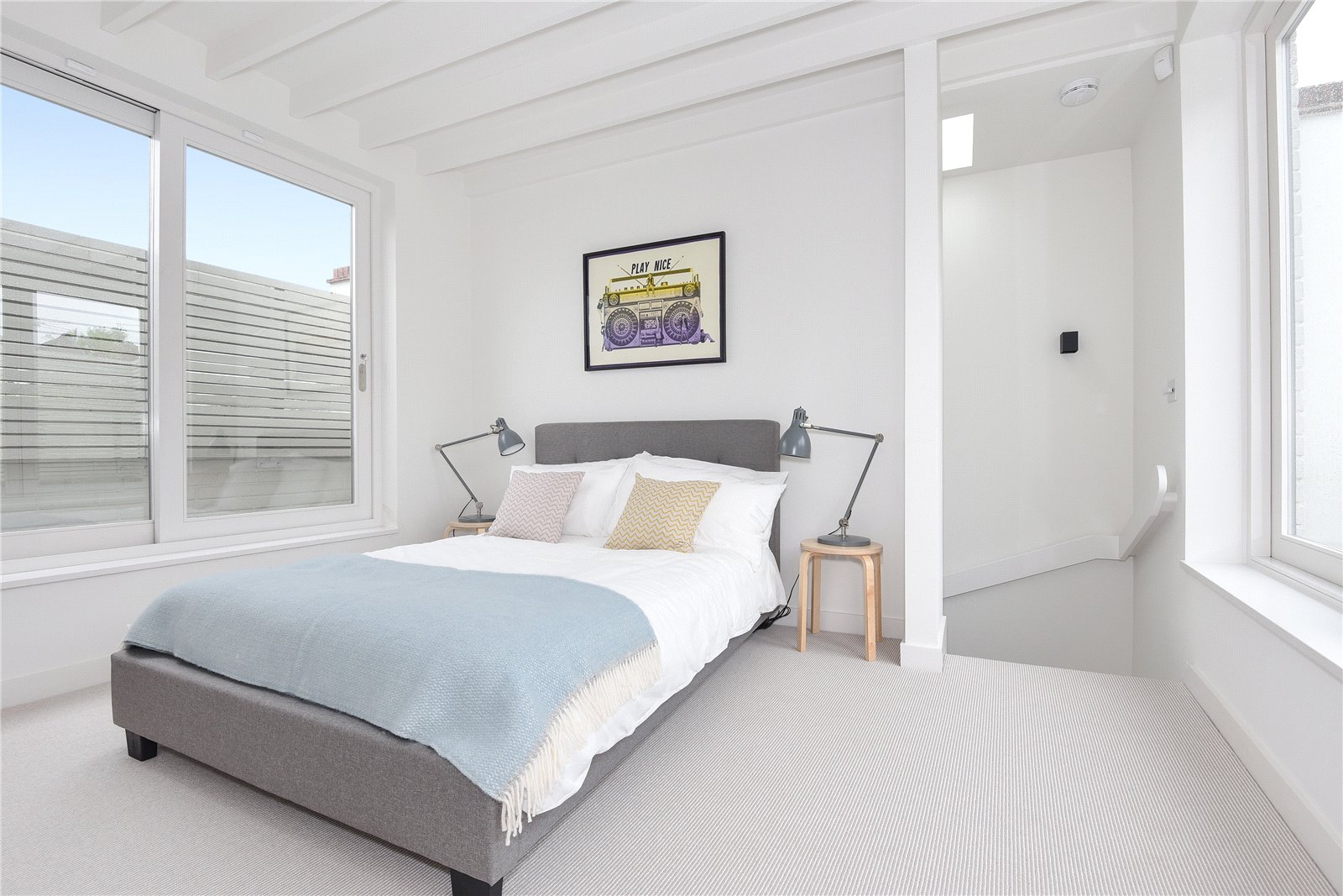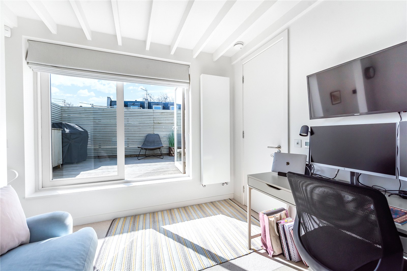 Open plan entertaining space with a poured resin floor and underfloor heating opens to a small rear courtyard garden on the ground floor. A large double, another double bedroom and a family bathroom occupy the first floor. On the top floor is a further double bedroom (also ideal for a home office) with en-suite shower and an amazing sun terrace. The property features beautiful bespoke joinery and is heated via an economical and state of the art heat-exchange unit.
